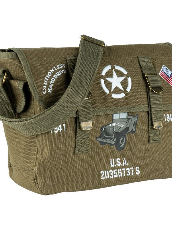 € 25,00 incl. btwDiscover this rugged shoulder bag with the theme Willy’s USA, inspired by the iconic military vehicles of World War II. Made from high-quality canvas cotton, this bag is perfect for military history enthusiasts. Sturdy and durable, ideal for daily use or as a unique collectible. Add a piece of history to your collection!